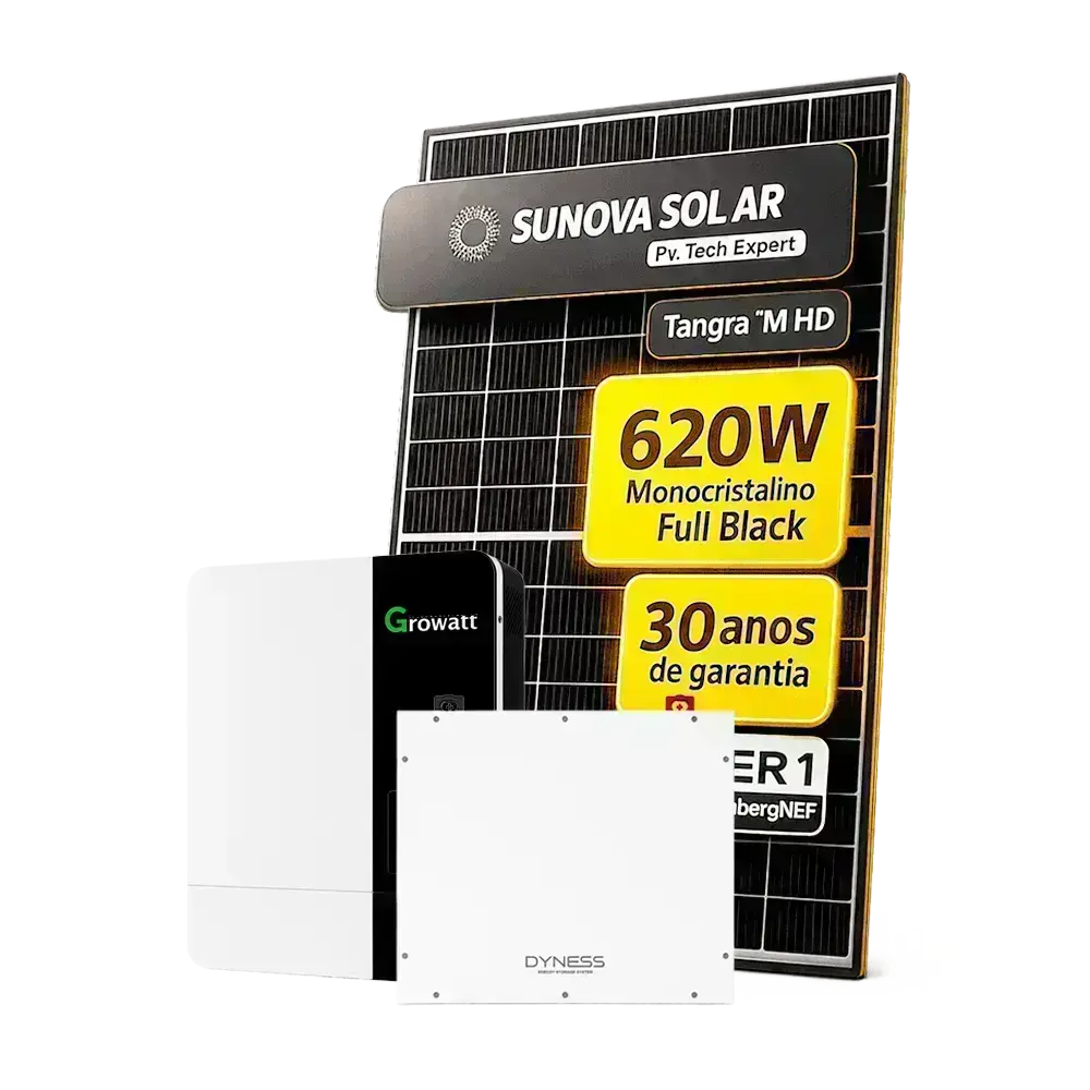 Kit Energia Solar Offgrid 6,20kWP 10 Painel Sunova 620W Inversor Growatt 5kW 220V Bateria Dyness 15,36kWh