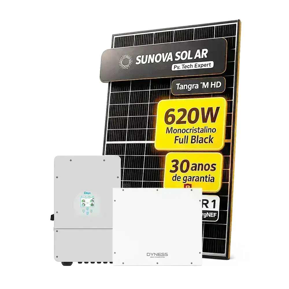 Kit Energia Solar Híbrido 700kWh Mês 5,58kWp 9 Painel Sunova 620W Inversor Deye 5kW Mono 220V Bateria Dyness 5,12kWh
